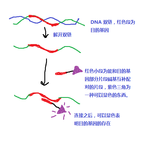 تحت الرقم الهيدروجيني ودرجة الحرارة والقوة الأيونية المناسبة ، يمكن لمسبار الحمض النووي أن يرتبط بالهيدروجين مع الحمض النووي أو الحمض النووي الريبي التكميلي أحادي الجديلة غير المسمى في العينة المراد اختبارها من خلال الاستفادة من الدقة العالية للتمسخ الجزيئي وإعادة التشبع والاقتران التكميلي الأساسي. تتحد لتشكيل مجمع مزدوج تقطعت به السبل.